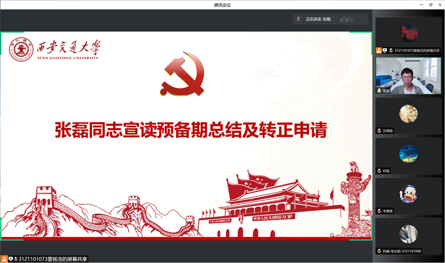 本次会议由支部书记雷杨浩同志主持。由于本支部张磊同志因故未能参加三月的预备党员转正大会,在本次组织生活会开始前,支部开展了张磊同志的党员转正大会。