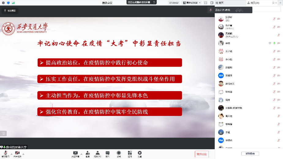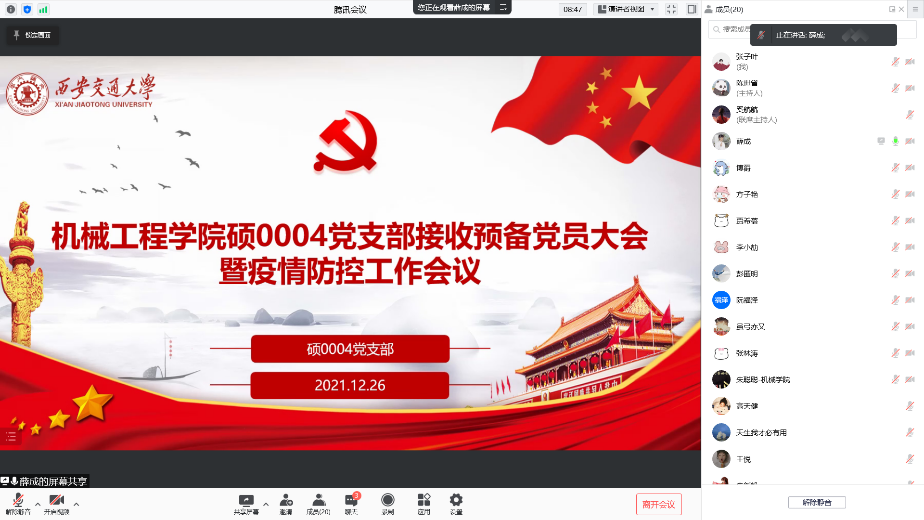 根据硕0004党支部发展党员工作计划,经征求党员和群众意见、支部委员会审查同意,12月26日晚,koko体育·(中国)官网硕0004党支部线上召开接收预备党员大会。同时,针对近期西安日趋严峻的疫情防控态势,党支部根据学校、学院要求,向与会成员传达学校、学院疫情防控工作会议精神,部署安排支部内疫情防控工作。