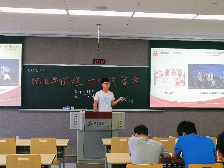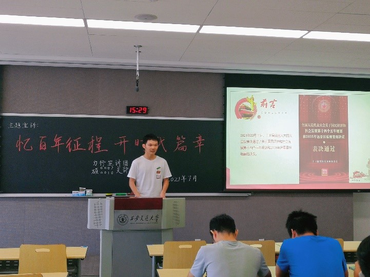 高博楠同学结合自己的所见所闻以及对于百年党史的所思所想,与同学们分享了不同时期下中国青年的理想与信念。随后通过对三位“七一勋章”获得者人物事迹的介绍,为在场同学树立了青年榜样。最后引用鲁迅先生的话对网络热词“内卷”做出回应,并进一步倡导广大青年要有志气,有骨气,有底气,从而不负时代,不负韶华,不负自己,更不负党和人民殷切期望。