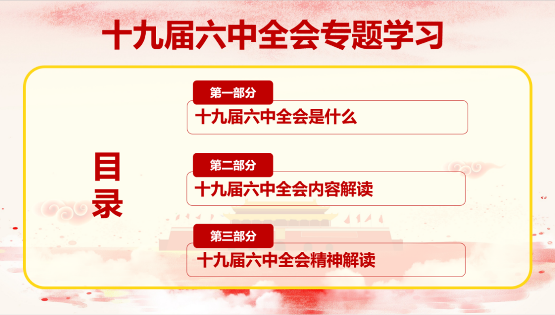 本次十九届六中全会专题学习的宣讲人名叫高博楠,他既是“力行”宣讲团的一员,同时也是S0010班级的一员。在本次宣讲中,他分为以下三个部分进行宣讲,分别是十九届六中全会是什么、十九届六中全会内容解读以及十九届六中全会精神解读。