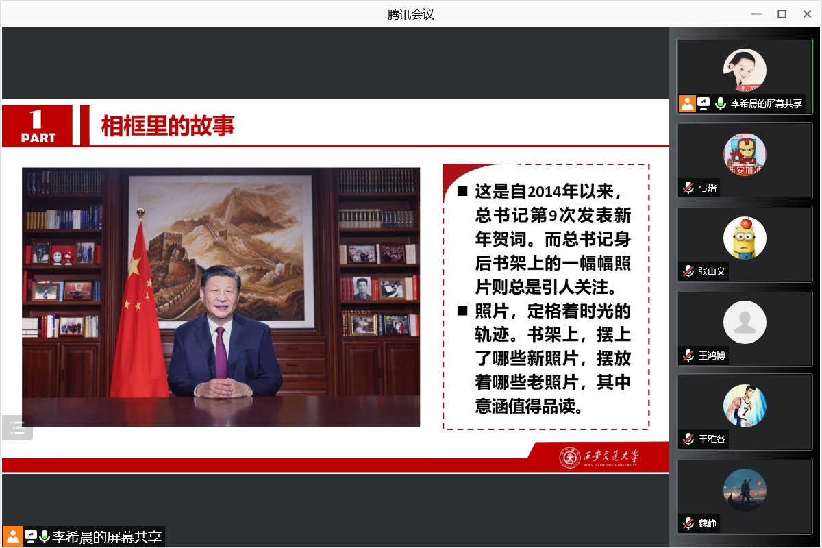 随后李希晨同志为我们介绍了习近平总书记背后“相框里的故事”,见证了一年来治国理政的非凡历程。四张建党百年重大活动照彰显不忘初心、开创未来的深刻内涵;五张“工作照”定格稳健开局的坚定足迹。回看历年来书架上的照片,不论照片如何更替,都有三个主题的照片始终不变:第一,同人民在一起;第二,同官兵在一起;第三,和家人在一起。