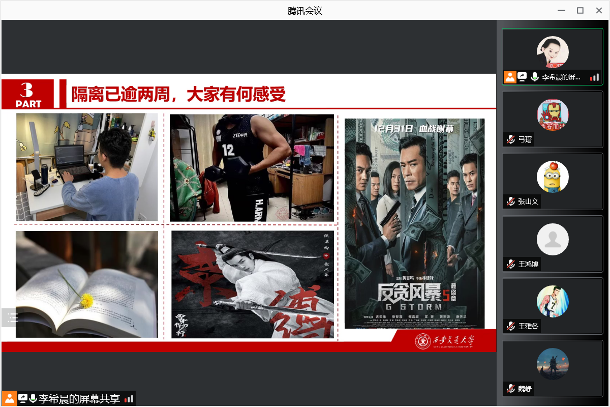 随后同学们分享了最近的心理状态、学习科研和课余生活,表达了对于学校、学校所有奋战在一线的教师和工作人员的感动和关心。通过生动有趣的沟通交流有效促进了同学们的感情,在疫情的大考面前正是大家的团结一心才能打赢这场疫情防控攻坚战!