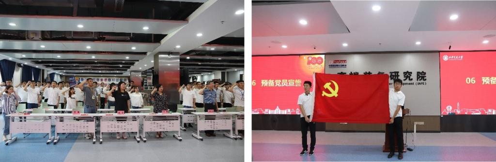新发展党员面向党旗宣誓,由硕9010党支部的宋林同志领誓。在场全体同志举起右拳庄严宣誓,一字一句,铿锵有力,向党和人民立下自己无悔的誓言。