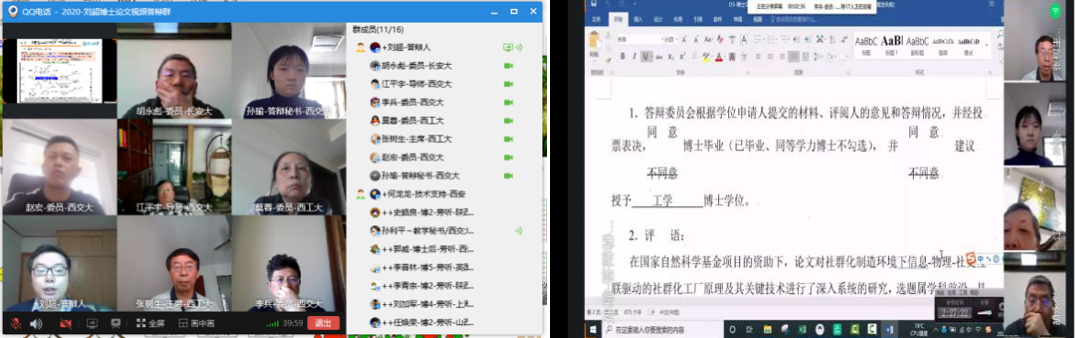 2月22日下午,机械学院江平宇教授指导的研究生刘超同学的博士学位论文在线视频答辩成功举行。通过采用QQ群的在线音视频与屏幕共享来演示PPT和学位论文的方式,答辩人刘超同学远程实时地向分布在国内外的答辩委员会专...