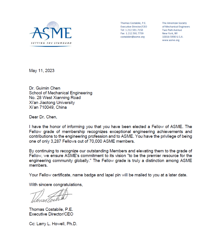 西安交大koko体育·(中国)官网陈贵敏教授入选ASME Fellow