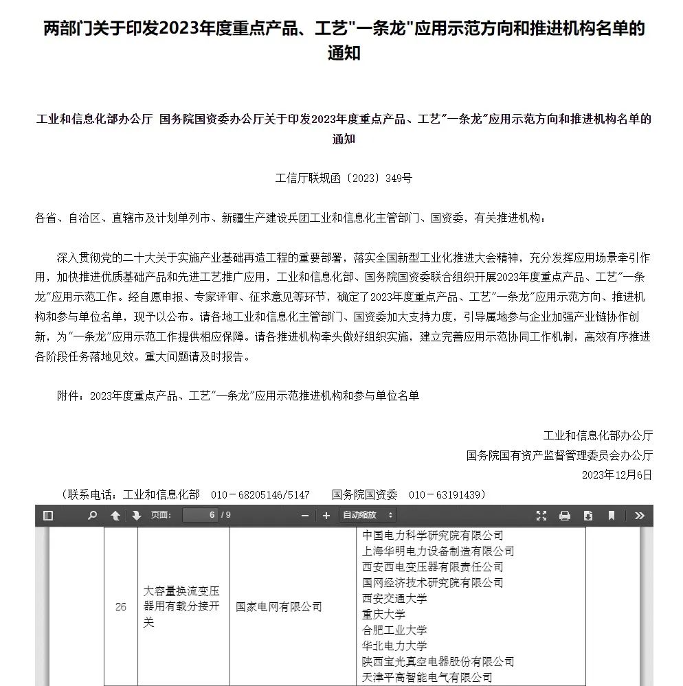 大容量换流变压器用有载分接开关入选2023年度重点产品、工艺一条龙应用示范方向和推进机构名单