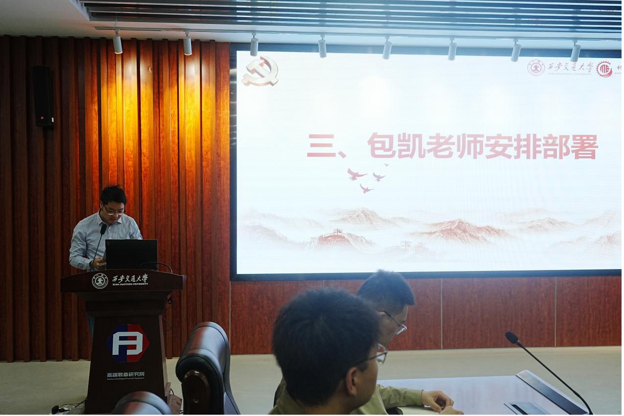 包凯老师传达学习《中共西安交通大学委员会深入贯彻中央八项规定精神学习教育实施方案》,并对学院贯彻落实工作提出要求。他指出,要提高政治站位,深刻认识规定聚焦“四风”的政治本质,其作为捍卫“两个确立”、做到“两个维护”的直接体现,需全体党员长期坚守并增强执行自觉。他要求,各党支部书记要落实第一责任人职责,形成层层抓落实的格局;同时加强监督检查,通过专门小组常态化监督,确保规定入脑入心、落地见效,为事业发展提供作风保障。