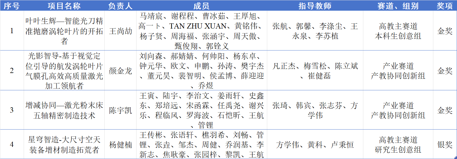 本次大赛,我院研究生团队积极响应,勇于创新,在多个高水平项目中深度参与、攻坚克难,最终取得了令人瞩目的佳绩。在主体赛中,我院“星穹智造——大尺寸空天装备增材制造拓荒者”项目获国家银奖。在产业赛道中,我院“光影智导——基于视觉定位引导的航发涡轮叶片气膜孔高效高质量激光加工领航者”、“增减协同——激光粉末床五轴精密制造技术”2个项目获国家金奖。