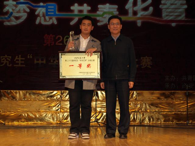 我院代表队由2010级的126名研究生组成,指挥郝婕,领唱张微,机械学院党委副书记訾艳阳、工会主席王朝辉、院办主任王收阁出席并参加了本次演出,凭借一曲《今天是你的生日,我的中国》赢得了满场观众的热烈掌声, 抒情豪迈的演唱,加上腰鼓队的激情舞蹈,使整个演出精彩纷呈。经过在场专业评委们的评审, 最终,以9.842分的最高成绩荣获了本次比赛的冠军.