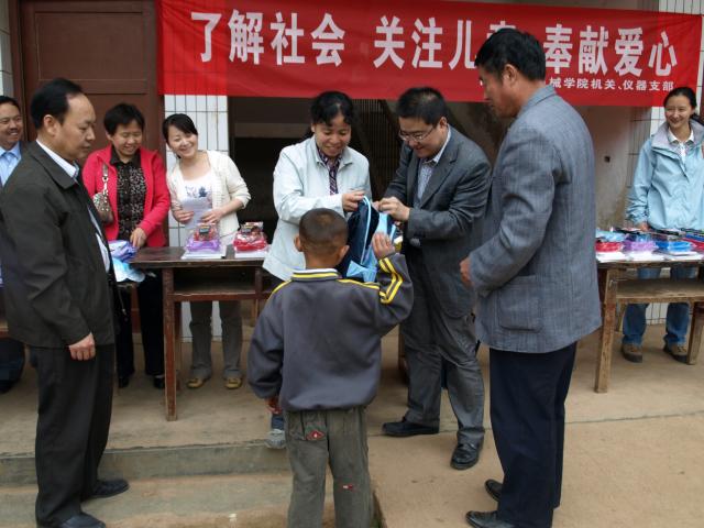 5月14日,机械学院机关支部与仪器支部积极响应学院分党委开展“创先争优”活动的号召,组织党员深入农村小学,进行了“了解社会、关注儿童、奉献爱心”的主题活动。两个支部来到蓝田县三里镇李后村小学,为15位特困生送去了书包、文具等学习用品,鼓励学生们好好学习,报效祖国,并且和李后村村支书及小学校长、老师进行座谈、交流,了解村办小学的现状和存在问题。