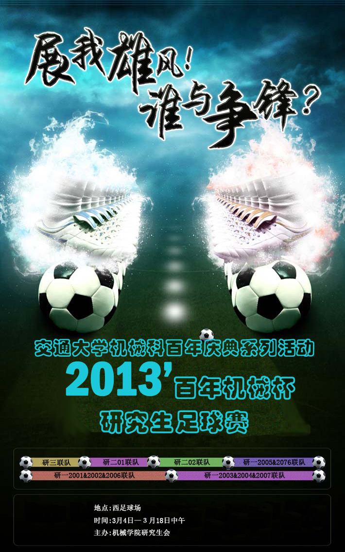 在机械学院百年院庆来临之际,我院特举办2013年koko体育·(中国)官网研究生“百年机情”杯足球赛。本次活动以“欢庆学院百年诞辰,增强各级同学交流”为宗旨,以促进学院各班、各年级之间的了解及交流、增进同学友谊、丰富同学课余生活为目的,以增强同学们的体质、提高学院的足球竞技水平、加强团队合作精神、促进科研为目标,是机械学院研究生体育、德育建设的标杆性活动。ティンバーランド ブーツ