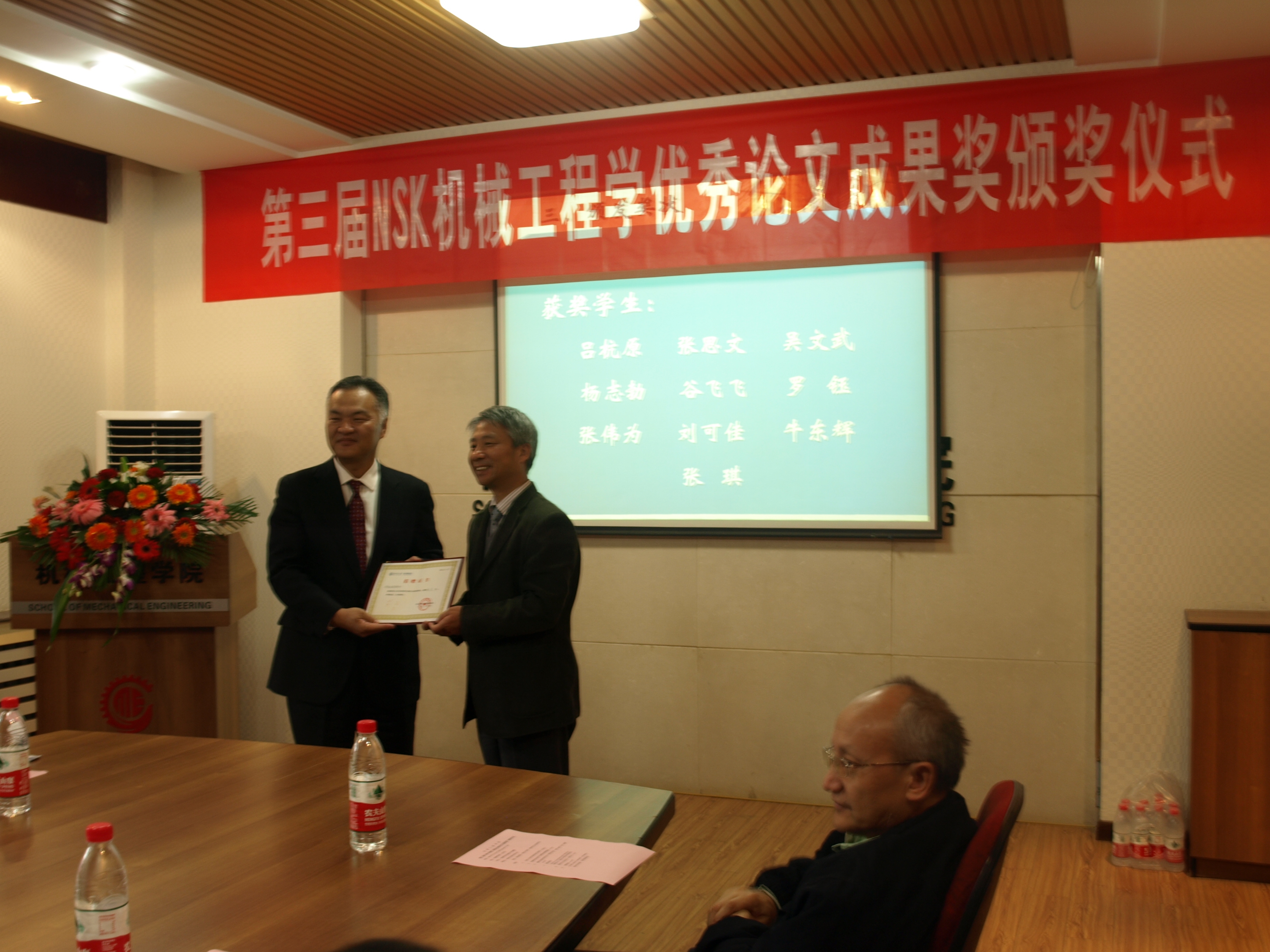 “NSK机械工程学优秀论文成果奖”,是由恩斯克投资有限公司设立的奖学金,旨在鼓励在机械工程专业领域内做出独特贡献和刻苦钻研的优秀研究生,今年是第三届,受奖学生10人,每人奖励5000元人民币。获奖名单是:吕杭原、张思文、吴文武、杨志勃、谷飞飞、罗钰、张琪、刘可佳、牛东辉、张伟为。