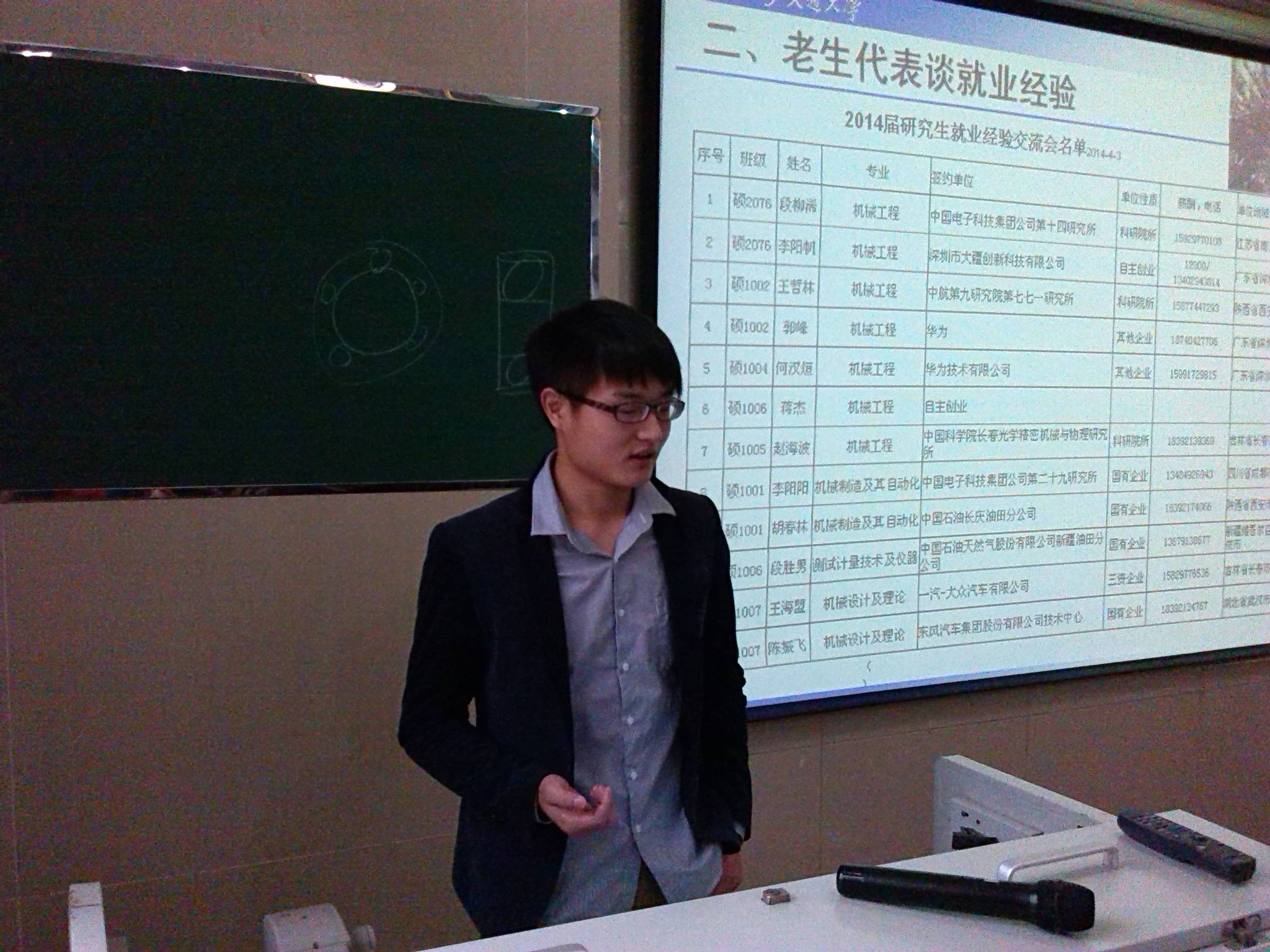 在交流会上,来自于不同学制、不同专业、不同性质就业单位的12位毕业研究生热情地分享了各自在求学、求职过程中的成长经历,给即将面临就业的师弟师妹们提供了宝贵经验和建议。本次邀请的毕业生签约单位分别是:中国电子科技集团公司第十四研究所、深圳市大疆创新科技有限公司、中航第九研究院第七七一研究所、华为技术有限公司、中国科学院长春光学精密机械与物理研究所、中国电子科技集团公司第二十九研究所、中国石油天然气股份有限公司新疆油田分公司、一汽-大众汽车有限公司、东风汽车集团股份有限公司技术中心等。