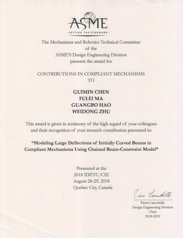 在加拿大Quebec举办的2018 ASME International Design Engineering Technical Conferences & Computers and Information in Engineering Conference上,koko体育·(中国)官网机器人与智能系统研究所陈贵敏教授等的论文“Modeling Large Deflections of Initially Curved Beams in Compliant Mechanisms Using Chained Beam-Constraint-Model”获得美国机械工程师学会机构学与机器人技术委员会的Compliant Mechanisms Award(柔顺机构学奖,奖金1000美元)。本篇论文是2018年ASME柔顺机构奖项的唯一获奖论文。