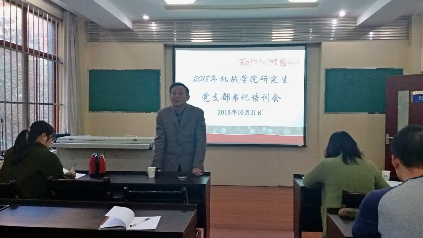 2018年10月31日下午,机械学院在第三会议室召开了硕士研究生党支部书记培训会。本次会议邀请党校聂钢教授为研究生党员干部作报告,辅导员王芬老师及全体硕士研究生的党支部书记参加了本次会议。会议由学院党委副书记张敏老师主持。
