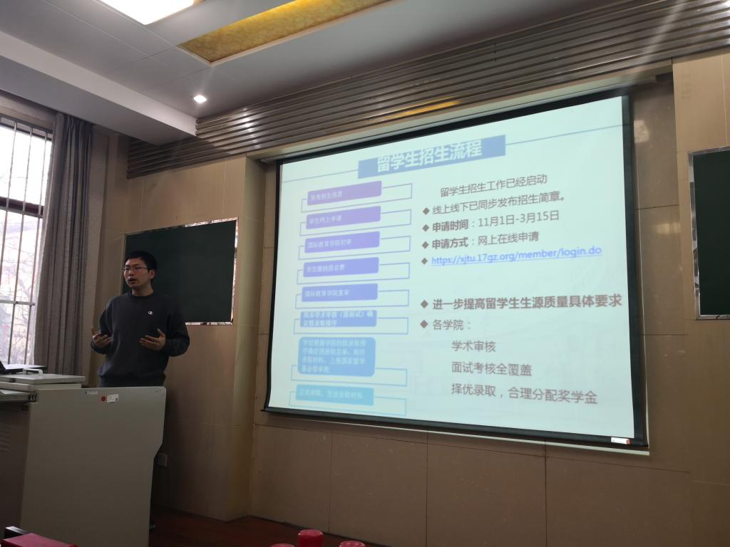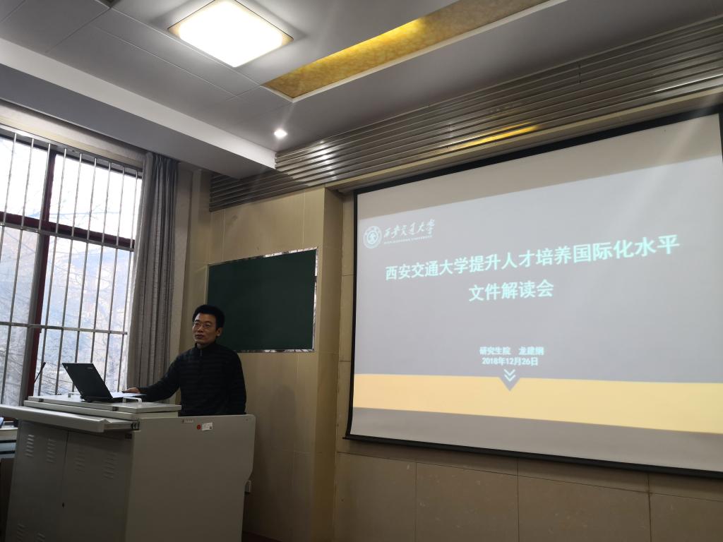 2018年12月29日下午四点,koko体育·(中国)官网留学生专项会议在学院第三会议室顺利召开。会议主要讨论了有关留学生招生录取,留学生培养,英文专业课建设和留学生奖学金设置等话题,针对学校近期新出台的《西安交通大学提升人才培养国际化水平实施方案》以及相关文件进行了深入解读。学院国际交流主管副院长杨树明教授,国际教育学院副院长温广瑞教授,国际合作交流处副处长韦学勇教授,研究生院招生办副主任田小永教授,系所代表和教师代表等出席了会议。