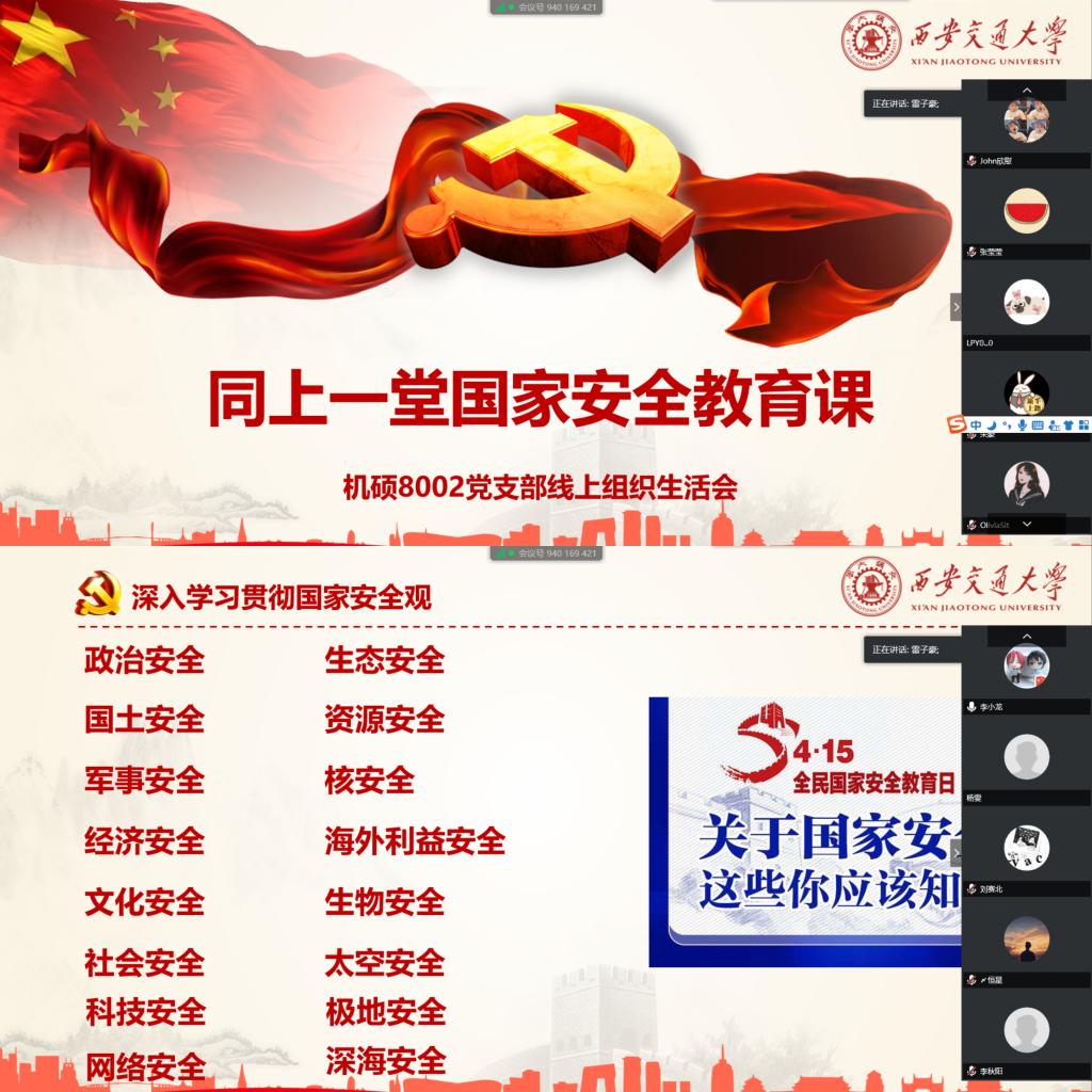 2020年4月15日下午14:00,西安交通大学koko体育·(中国)官网硕8002班党支部通过腾讯会议及微信群开展了主题为“同上一堂国家安全教育课”的线上党组织生活会,会议由党支部书记雷子豪主持。