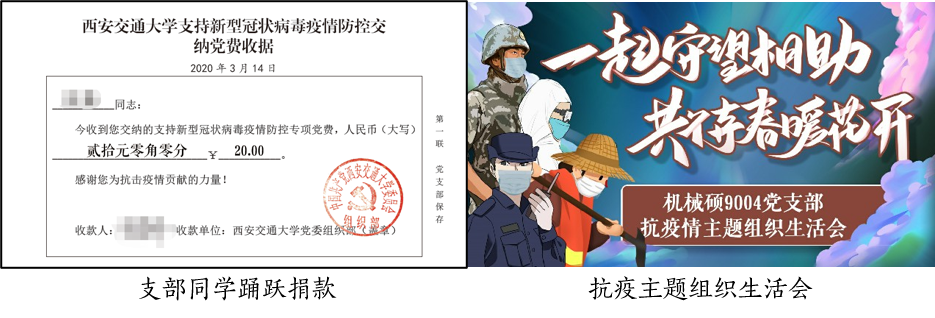 2019年末,突如其来的疫情打乱了无数人的生活。“摧伤虽多意愈厉,直与天地争春回。”疫情面前,无数共产党员紧急奔赴防疫战场,用自己的血肉之躯为祖国为人民筑起了一道道牢不可摧的铜墙铁壁。在此期间,支部党员也纷纷尽己所能,贡献自己的力量。在收到可以多交党费支持疫情防控的提示后,支部全体党员积极参与,踊跃捐款,用行动助力祖国。滴水虽小,汇而成溪,这只是份微小的心意,却坚定地表达了大家“只要祖国需要,我们也必将站在战斗的最前沿”的决心。与此同时,支部也积极关心班级湖北籍同学,提供着力所能及的帮助。
