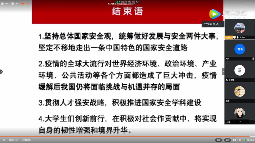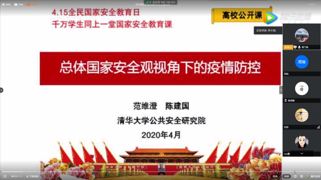 2020年4月15日下午14:00,硕8002党支部通过腾讯会议及微信群开展了主题为“同上一堂国家安全教育课”的线上党组织生活会,会议由党支部书记雷子豪主持。会议首先认真学习了近几年来习近平总书记围绕总体国家安全观发表的一系列重要论述。理论学习之后支部同志共同收看了清华大学公共安全研究院范维澄院士讲授的高校公开课“总体国家安全观视角下的疫情防控”。在公开课之后的交流讨论中,来自湖北襄阳的李小龙同志表示:“在这次新冠肺炎病毒席卷全球的形势下,生物安全得到了极大的重视。这次我国新冠肺炎疫情虽说给我国带来了巨大的损失,但同时也积累了传染病等公共安全的经验,从问题导向驱动健全我国国家安全体系,提高其‘韧性’”。
