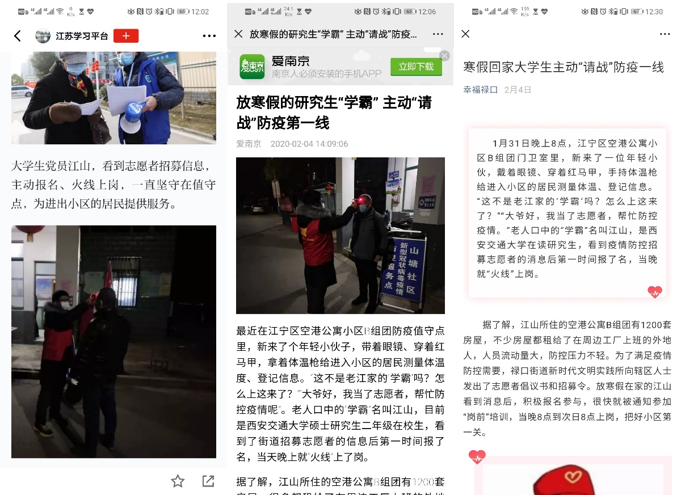 江山同志带头响应党的号召,毅然投身到社区防疫志愿服务活动中。在社区防疫工作中,协助社区工作人员进行防疫知识宣传、社区居民体温测量登记、外省归来务工人员信息登记、社区值守值班等志愿服务活动。从1月31日起,一直到2月29日,他通宵值过班,站过岗,为社区的防疫工作做出力所能及的贡献,也得到了社区工作人员的肯定与感谢,得到了社区居民朋友的认可。江山同学的事迹受到了“学习强国”、“南京晨报”以及当地政府的报道,充分展现了西安交通大学学生的家国情怀和社会责任感。