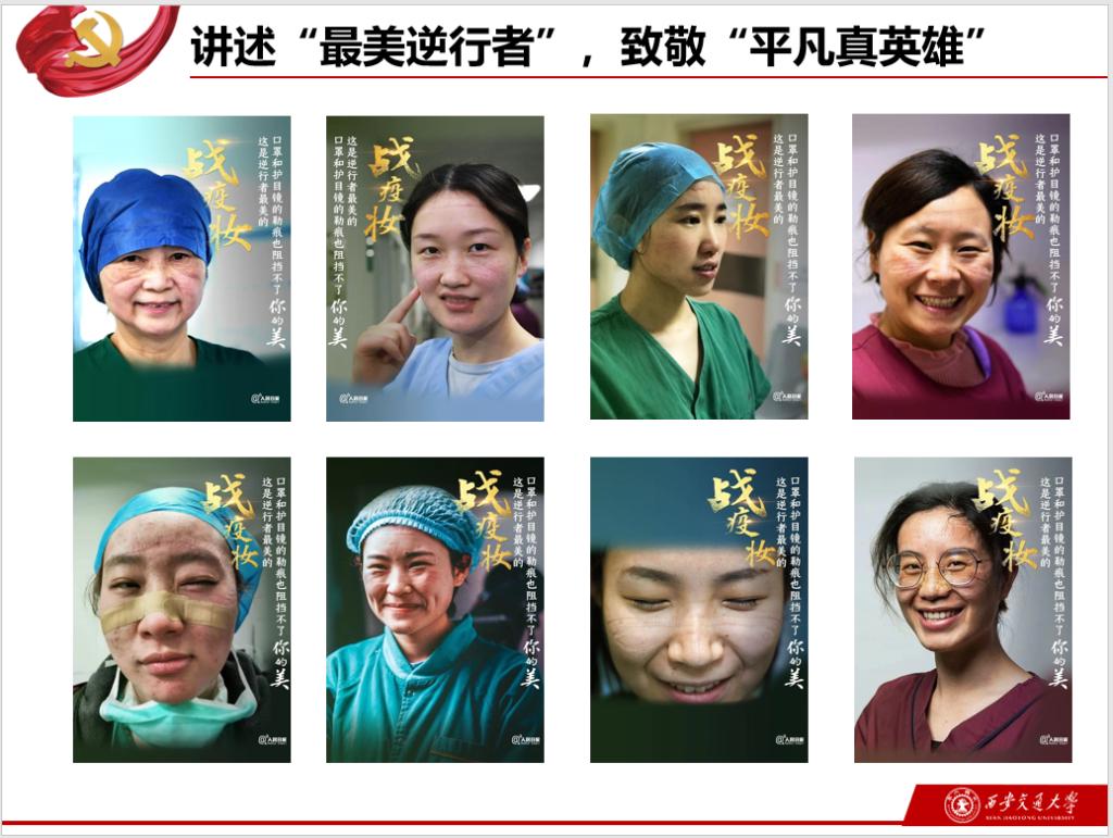 疫情当前,更是考验党员能否牢记使命的时候,更能彰显坚定理想信念的品格。抗疫期间涌现出许多感人事迹,党员们一起“讲述‘最美逆行者’,致敬‘平凡真英雄’”。可能是从新闻报道中获知,可能就是身边的亲人朋友,他们舍小家、为大家,为防控疫情做出了巨大贡献,甚至许多医护工作者失去了宝贵的生命。疫情正值春节,许多医护人员放弃与家人团聚前往湖北支援,他们脸上被防护装备勒出一道道血痕,为了节省防护装备,经常一天只吃一顿饭,他们在繁重的工作面前往往每天只能休息几个小时,他们是“最美逆行者”;除了医护人员,还有方舱等医院的建设者、外卖小哥、送餐老板等等许多自愿为抗击疫情做出贡献的人,他们平凡却伟大,他们是“平凡真英雄”。同时,我们西安交通大学也派出许多医术精湛的医护人员,据统计,截至3月6日8时,陕西医疗队累计救治患者1974人,其中重症和危重症患者623人,累计治愈患者1053人。