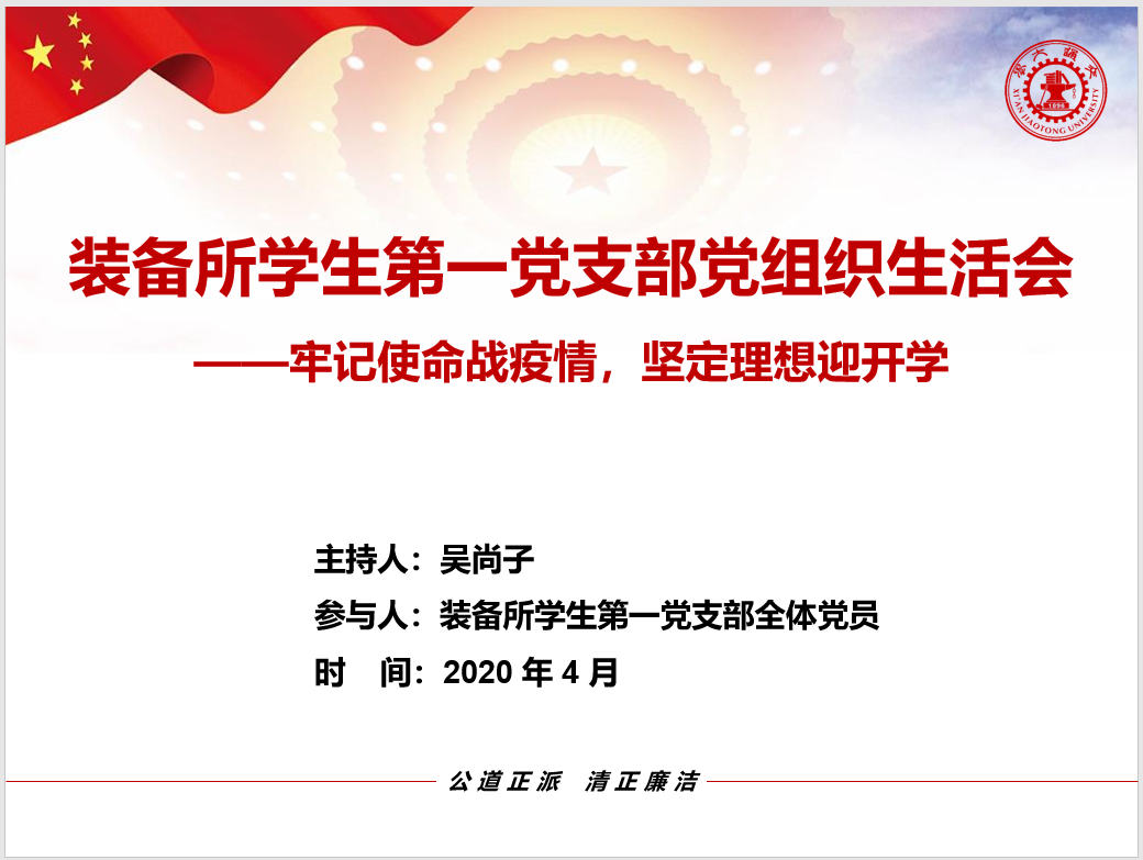 牢记初心使命,坚定理想信念。2020年4月21日,koko体育·(中国)官网装备所博士生第一党支部开展了主题为“牢记使命战疫情,坚定理想迎开学”的线上党组织生活会,会议由党支部书记吴尚子主持。
