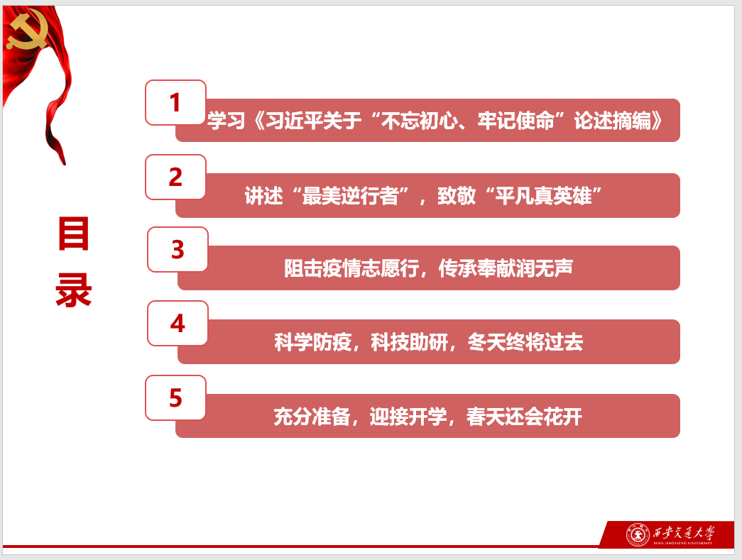 科学防疫,科技助研,冬天终将过去;充分准备,迎接开学,春天还会花开。防控疫情期间,同学们采取居家学习科研的方式,随着4月19日陕西省教育厅发布关于做好陕西高校2020年春季学期开学工作的通知,开学也终于被提上议程。关于返校前如何在家高效科研,以及如何安全返校并在返校后科学防疫,大家献计献策,分享防疫知识,并从返校前防疫、居家科研和返校后防疫整理成《科学防疫&居家科研手册》,期望通过党组织生活会,对同学们给予一定的帮助。