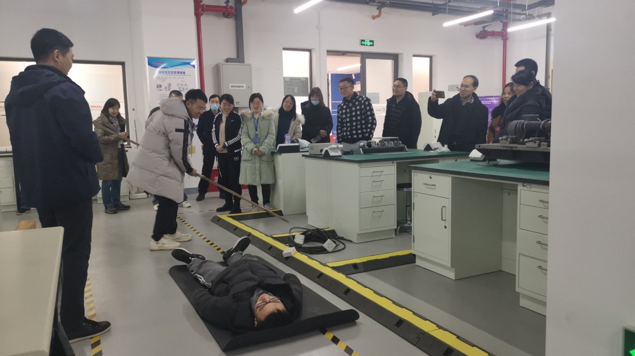 结合高端装备研究院实验室分布建设情况,应急演练首先模拟学生做实验发生触电“事故”。张明泉老师通过情景教学生动形象地展示了发生触电“事故”后,“切断电源(互救)—报警救援—现场警戒—信息上报”等应急处置流程。演练中,参演师生积极利用现有器材,救援“触电”学生,张明泉老师还向参演师生例举了实验过程中容易发生触电事故的几类情况和救护措施。