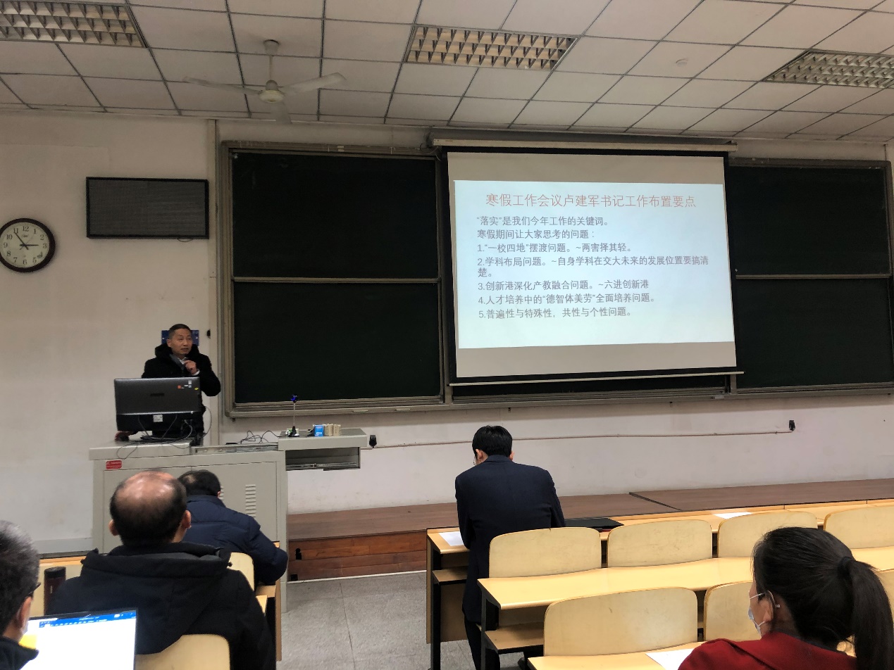 王朝晖书记进一步强调了校党委书记卢建军在学校寒假工作会议上的讲话精神和工作要点,希望大家寒假期间思考以下问题:一是“一校四地”摆渡问题;二是学科布局问题;三是创新港深化产教融合问题;四是人才培养中的“德智体美劳”全面发展问题;五是普遍性与特殊性、共性和个性问题。随后,王书记从抗击新冠疫情、创新港建设、学科评估等方面做了工作汇报,未来的发展建设可谓“雄关漫道真如铁,而今迈步从头越”,王书记以此鼓舞大家前进的道路上,不要怕,克服困难,勇往直前。