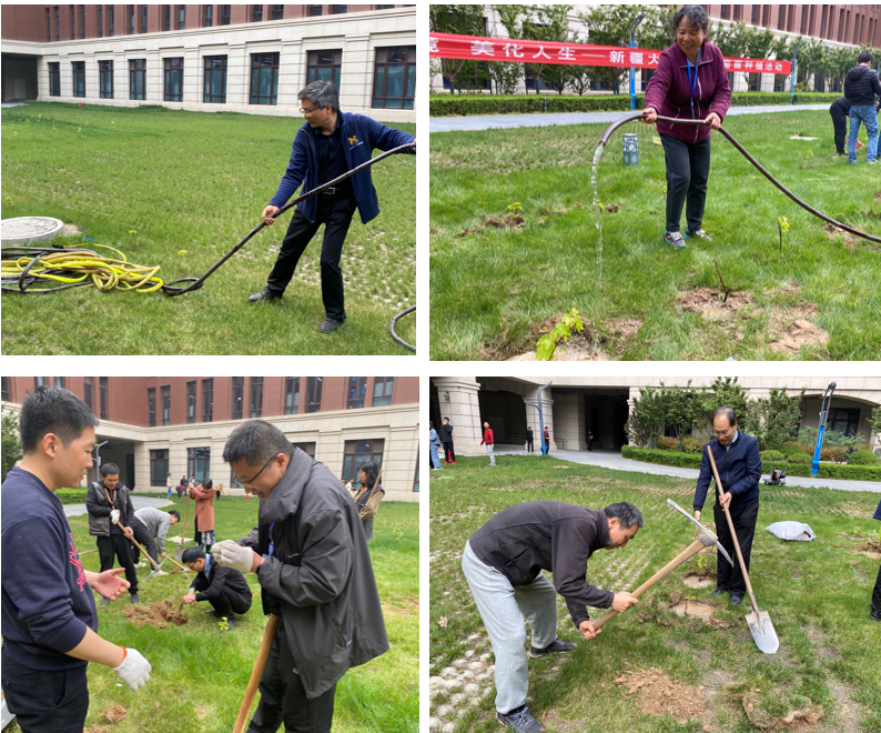 新疆葡萄名远扬,高端院内满园香。种植活动伊始,学院工会副主席李云龙老师致辞,向大家介绍了葡萄苗的由来,以及我院与新疆大学的深厚友谊。随后,丁立库、杨江坤、苏宇三位老师讲解葡萄苗种植要点,叮嘱大家“一定要挖30厘米见方的坑,这样葡萄苗成活率才高”,并组织师生列队分组、划分区域、领取工具。葡萄种植过程中,大家严格要求,拉线取直,精准测量……2个小时的劳动,大家干得热火朝天。