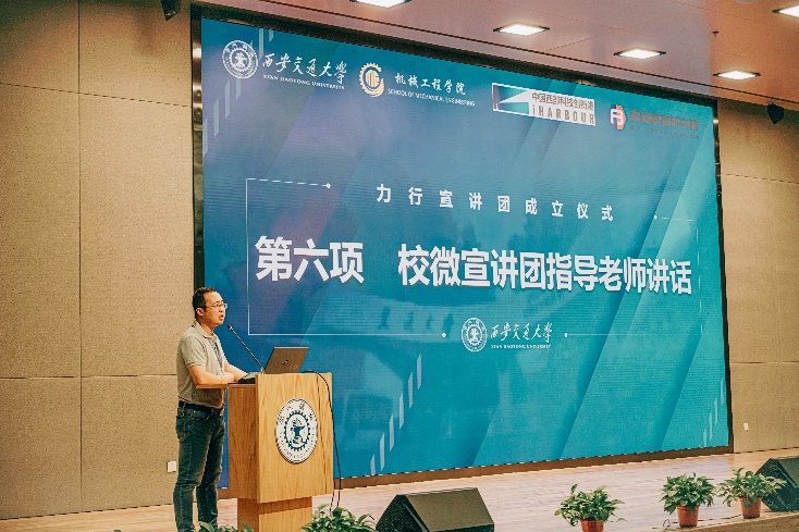 校微宣讲团指导老师陈晨强调了宣传工作对于学校思政教育及文化宣传的重要性,是学校进行“立德树人”、培养时代新人的重要载体。他肯定了成立力行宣讲团的意义,并代表校宣讲团表示支持,他嘱托力行宣讲团成员要加强理论学习和外出实践,加强与其他宣讲团的交流,把百年机械的好故事和制造强国的好故事讲出去是百年交大机械人的使命和责任。