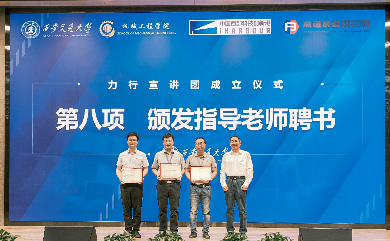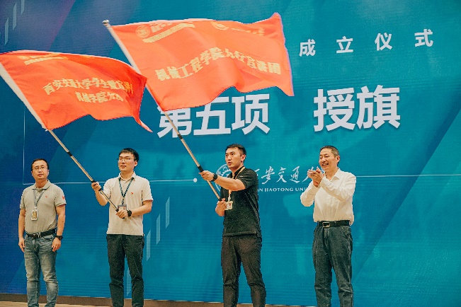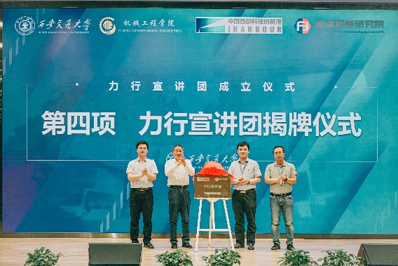 王朝晖、薛周利、苏翔、陈晨共同为力行宣讲团揭牌。陈晨、王朝晖向力行宣讲团负责人杨江坤、机械学院团工委书记苏宇授旗。