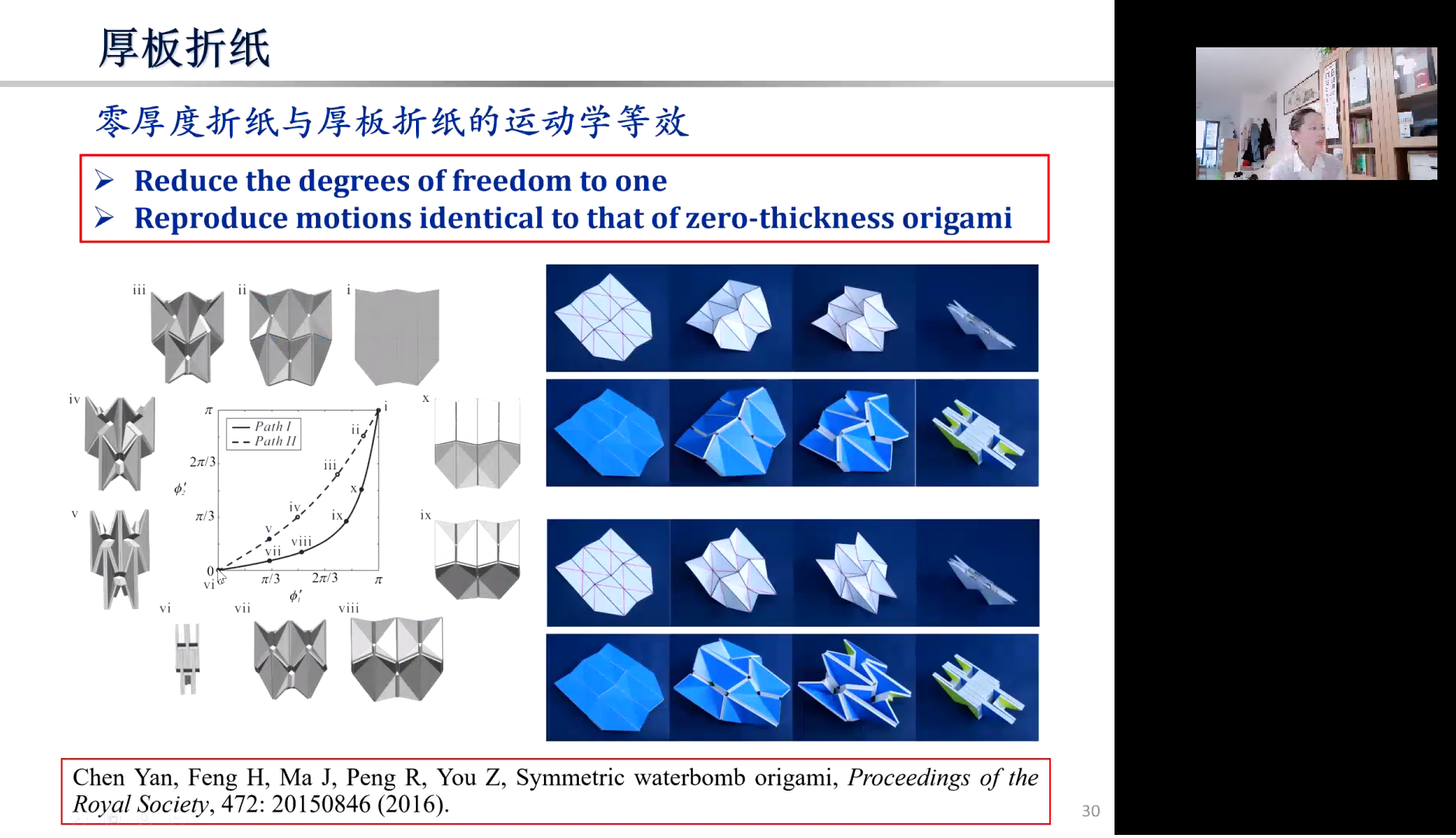 马小飞副所长通过大口径星载天线、柔性太阳翼及伸展臂等方面的应用,向大家展现了可展开结构的重要性和未来的发展趋势,并探讨了未来可展开结构与仿生学、智能材料、在轨组装及在轨建造等方面的交叉融合;陈焱教授重点介绍在机构学和力学交叉的领域已经开展的厚板折纸的代表性研究成果,特别是密铺零厚折纸与厚板折纸的运动学综合方法,并结合航天展开结构的工程需求,探讨了折纸结构发展的趋势;由衷教授从基本的运动单元体出发,系统地展现了模块化的三维运动变体结构与超材料的设计方法,探讨了运动分叉对超材料中通道的调控、以及常值负泊松比超材料的实现。三场报告全面展现了折纸技术既可以是生活中的艺术点缀,也可以是国之重器,既是一种艺术创作,同时也蕴含了重要的机械科学方法。