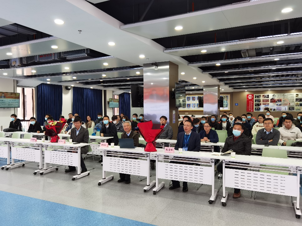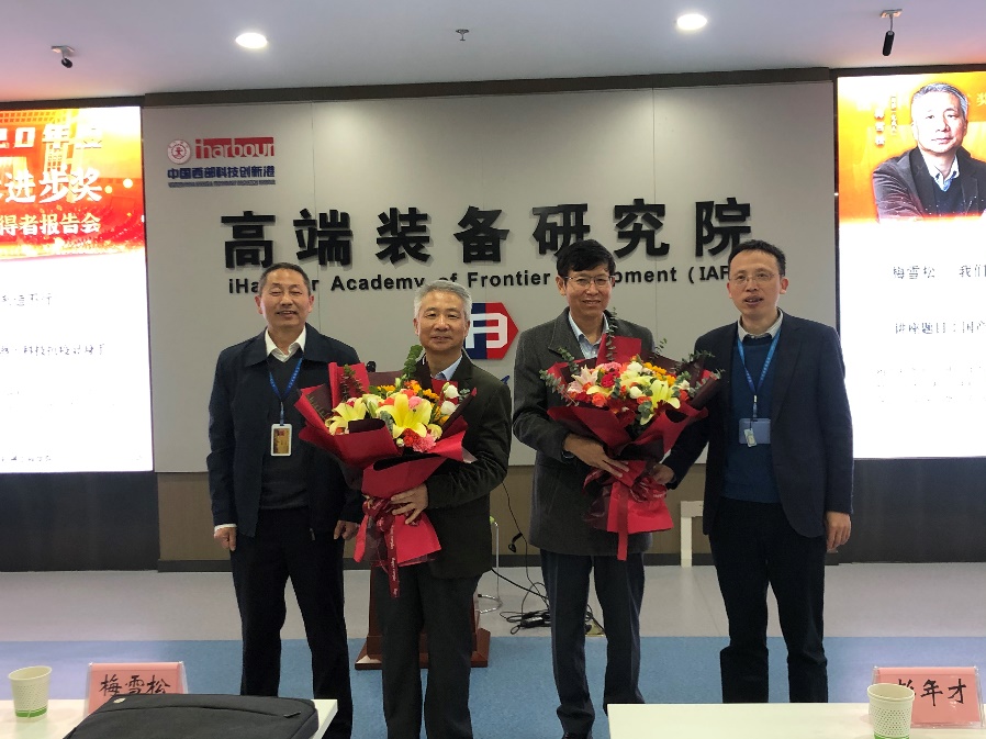 王朝晖书记代表机械学院对梅雪松教授、彭年才教授表达祝贺,同陈雪峰院长一同为两位获奖教授献花。他以“荣誉”、“学习”、“发扬”为本次报告会的关键词,强调两位教授获奖既是学校的荣誉又是学院的荣誉,青年教师和博士生要向两位教授学习,继续传承和发扬西迁精神,争做“西迁新传人”,在国家科技进步的过程中贡献更多的交大力量。