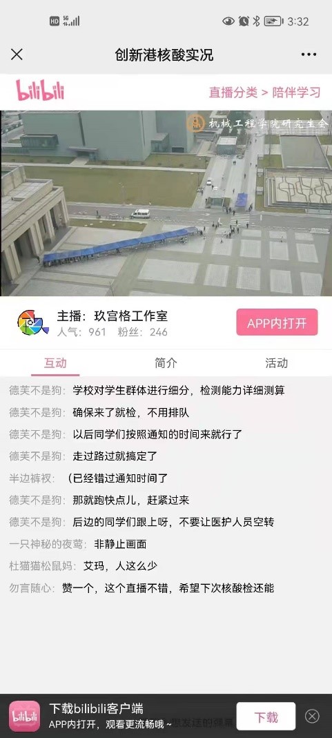 2.直播核酸检测队伍情况,为全校师生提供便利。“快去核酸,机械学院研究生会在核酸检测现场直播,现在人特别少!”“等会再去,看直播人还不少”“今天核酸检测好快啊,感觉速度得是前天的十分之一!”为了提高学校核酸检测速度,让学校师生在气温零下的寒冷冬天少排队,把宝贵的时间用在学习和科研上,机械学院研究生会一直在想如何利用研会力量,减少大家排队时间。这次核酸检测,机械研会玖宫格工作室对核酸检测排队情况进行现场直播,让大家在工位、在实验室、在办公室就能实时观看核酸检测排队情况,进而根据自己的时间和排队人数前往核酸检测点,将往日至少1小时的核酸检测排队时间缩短到10分钟左右,极大提高了学校核酸检测的效率,赢得了学校同学的一致好评。