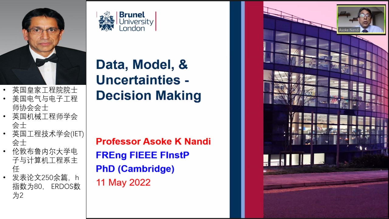 Asoke Kumar Nandi教授做了题为“Data, Model, & Uncertainties – Decision Making”学术报告,结合了过去和现在的实例,分析了数据生成,模型建立和决策制定之间的关系,探讨了在大数据时代数据、模型和不确定性在制定决策中的作用。