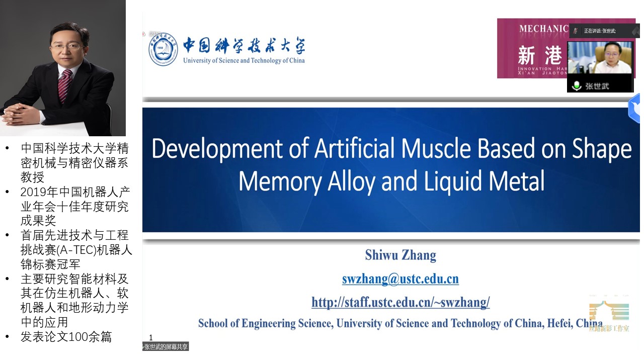 张世武教授做了题为“Development of Artificial Muscle Based on Shape Memory Alloy and Liquid Metal”学术报告,介绍了基于形状记忆合金(SMA)和液态金属等智能材料研制软体机器人的工作,所开发的基于形状记忆合金的灵巧手、软体夹持器、柔性手臂等软体机器对执行特殊任务具有重要的应用前景。
