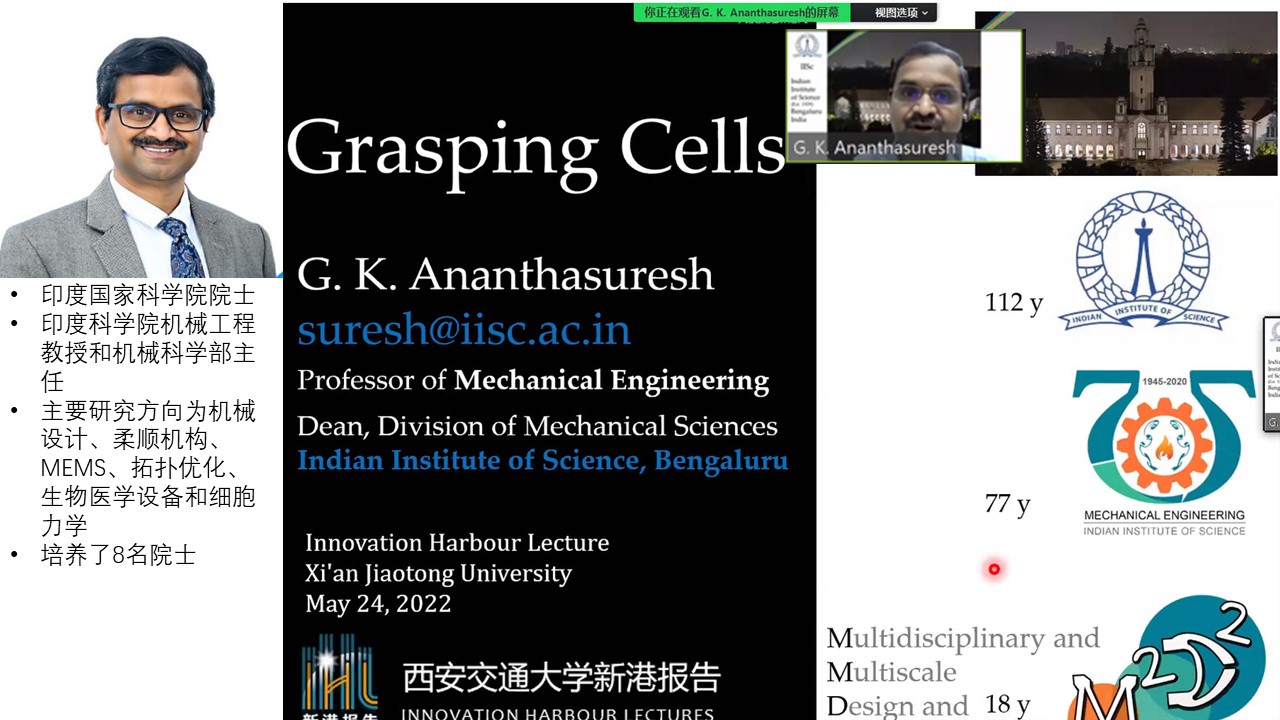 G. K. Ananthasuresh教授做了题为“Grasping Cells”学术报告,介绍了病态细胞机械性能的变化规律,讲解了如何将微机械工具和计算机技术融合,从而有效评估悬浮或粘附在自然介质中单细胞的力学性能,并介绍了该技术在医疗诊断、微纳机器人等方面的应用前景。