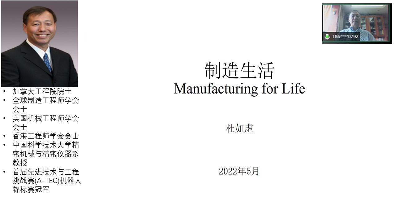 Ruxu Du院士做了题为“Manufacturing for life”学术报告,展示了与人类息息相关的“衣、食、住、行”制造改进方式,着重从“衣”方面分享了服装材料、纺纱、织造、染色和缝纫5个重要的制造过程,并针对性地指出了智能制造未来的改革措施和发展方向。