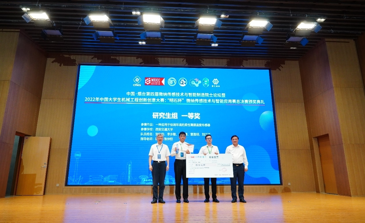 2022年8月13日至14日,2022年第3届中国大学生机械工程创新创意大赛:“明石杯”微纳传感技术与智能应用赛总决赛在烟台举行。大赛由中国机械工程学会主办,入选《全国普通高校学科竞赛排行榜》,是教育部认可的57项全国性大学生竞赛项目之一。大赛吸引了全国25个省份、102所高校的293个团队报名。经过激烈角逐,共有129项作品(本科生组62项,研究生组67项)参加本次总决赛。最终,西安交通大学精密工程研究所的参赛作品《一种应用于极端环境的柔性薄膜温度传感器》获得研究生组一等奖。