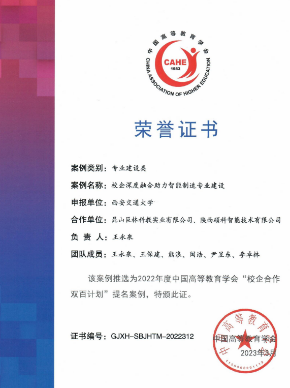 我院入选案例以数字孪生智能制造实践教学平台建设为主线,发挥koko体育·(中国)官网与昆山巨林科教有限公司、陕西硕科智能技术有限公司、西安吉利汽车等各方优势,打破知识壁垒,促进产教融合,依托平台开发高阶性教学项目,开发示范性案例与教材,建成资源融合充分、结构体系完整、学科特色鲜明的实践教学体系,支撑传统专业转型升级和智能制造工程专业建设,推动和引领了新型工程科技人才培养理念及模式改革。