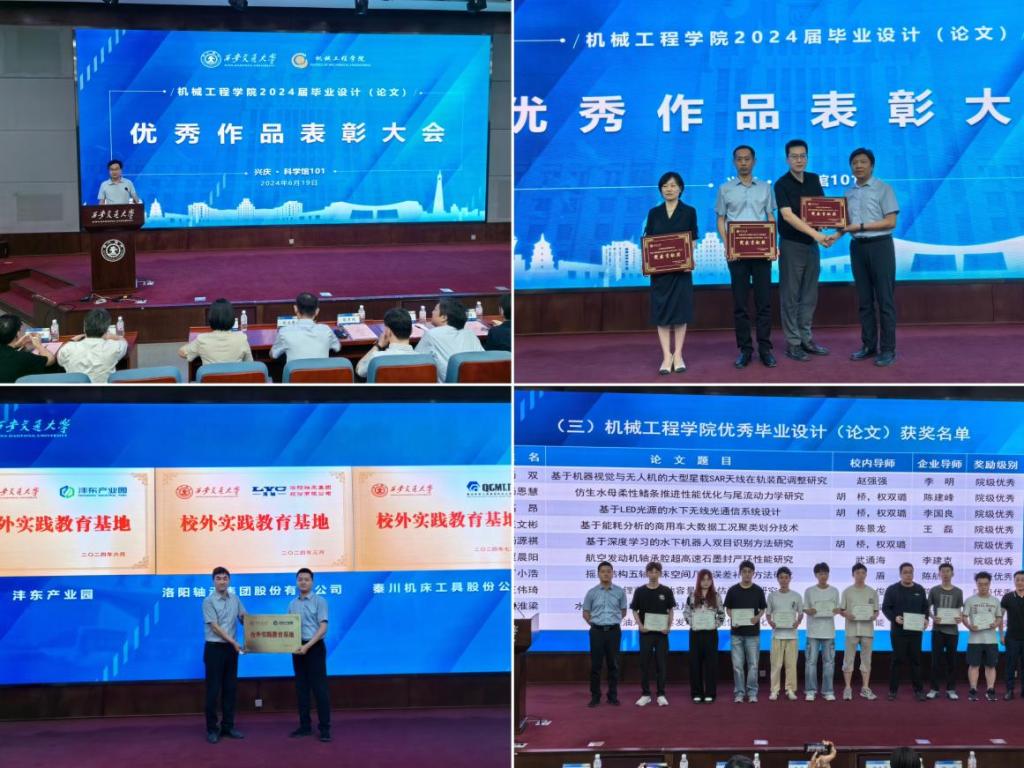 与会企业领导与专家代表,以及学校相关部门和学(书)院领导共同为荣获优秀作品荣誉的学生颁发奖项。大会特别对在“2024中国大学生机械工程创新创意大赛‘精雕杯’毕业设计大赛”获奖的学生进行了表彰。张彦鹏为沣东产业园发展有限公司、洛阳轴承集团股份有限公司、秦川机床工具集团股份公司三个校外实践教育基地授牌,张俊斌为在本次校企合作毕业设计工作中作出特别贡献的陕西重型汽车有限公司汽车工程研究院、特变电工股份有限公司、中国西电集团有限公司颁发了荣誉奖牌。