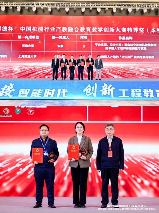 在本次大会上,西安交通大学荣获第七届“精雕杯”毕业设计大赛优秀组织奖及首届“科德杯”中国机械行业产教融合教育教学创新大赛特别贡献奖。王永泉副院长、周光辉副院长分别代表学校领奖。