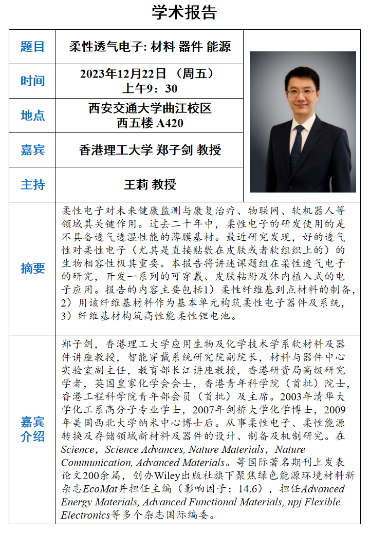 学术报告——柔性透气电子: 材料 器件 能源
