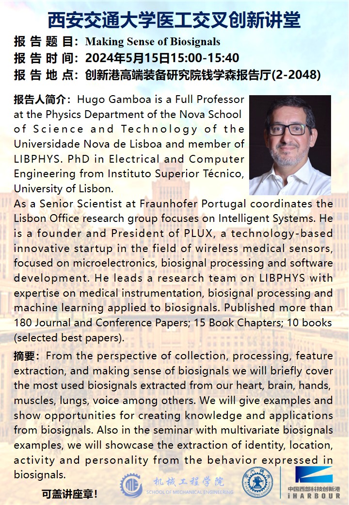 报告人简介:Hugo Gamboa教授,葡萄牙新里斯本大学终身教授,生物医学工程博士点主任;德国弗劳恩霍夫(Fraunhofer)研究所葡萄牙分所所科学委员会主席;PLUX可穿戴式无线生物信号传感器公司创始人、总裁;里斯本NOVA高新技术创业孵化院院长;国际生物医学工程系统和技术大会(BIOSTEC)主席。