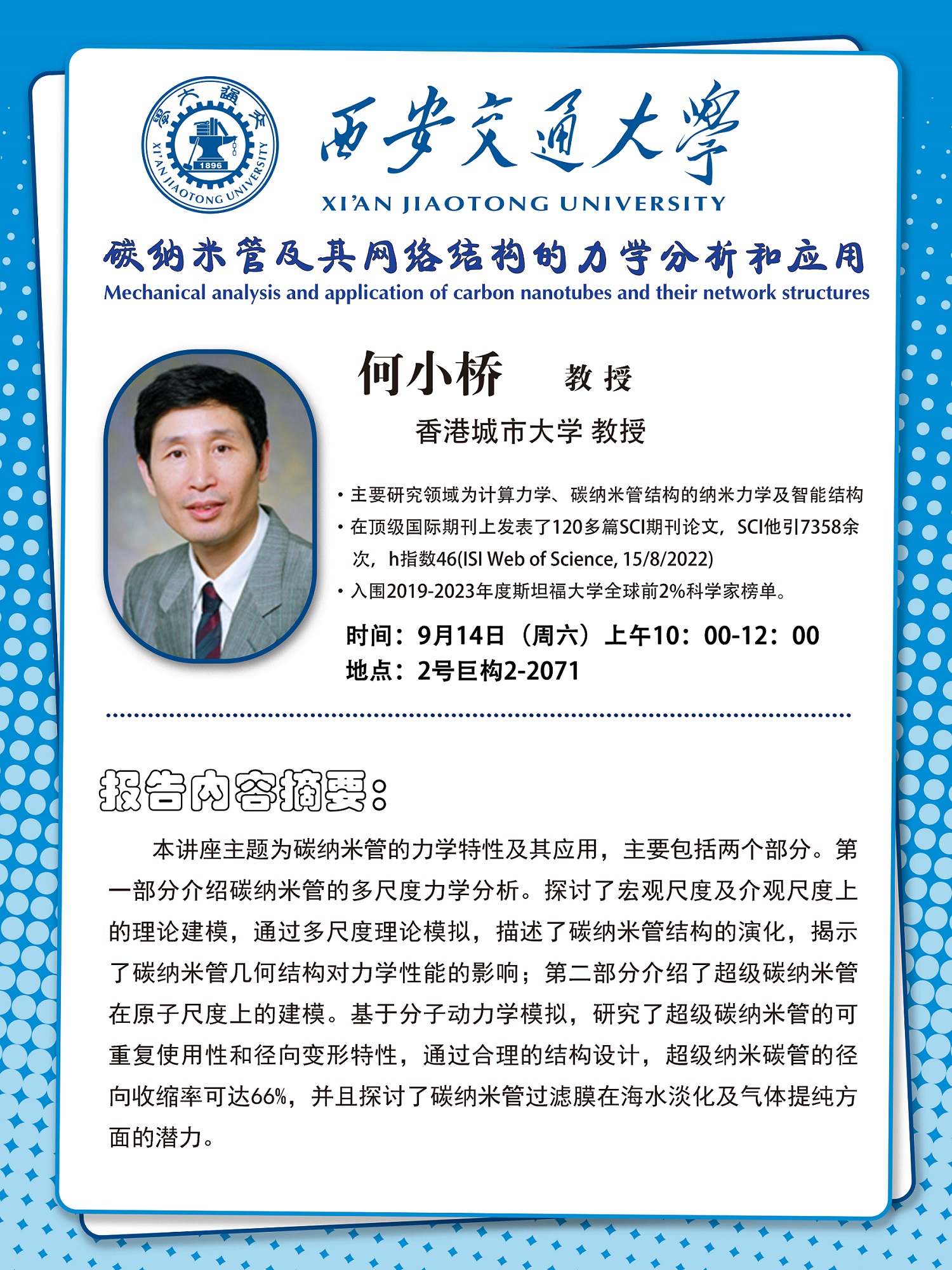 香港城市大学何小桥教授讲座通知
