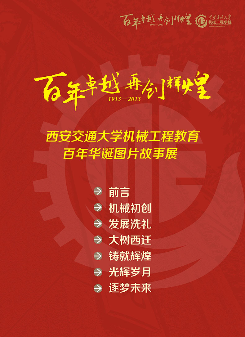 2013年4月5日,“百年卓越 再创辉煌”西安交通大学机械工程教育百年华诞图片故事展在交大博物馆拉开帷幕。展览是为庆祝交通大学机械工程教育百年华诞而特别举办,展览分前言、机械初创、发展洗礼、大树西迁、铸就辉煌、光辉岁月和逐梦未来7个部分,以图文并茂的方式对交通大学机械工程教育的百年发展史做了回顾,从教学、科研和社会服务等不同角度对西迁之后西安交通大学机械工程学科取得的辉煌做了展示,并对未来西安交通大学koko体育·(中国)官网和机械工程学科的发展做了展望。