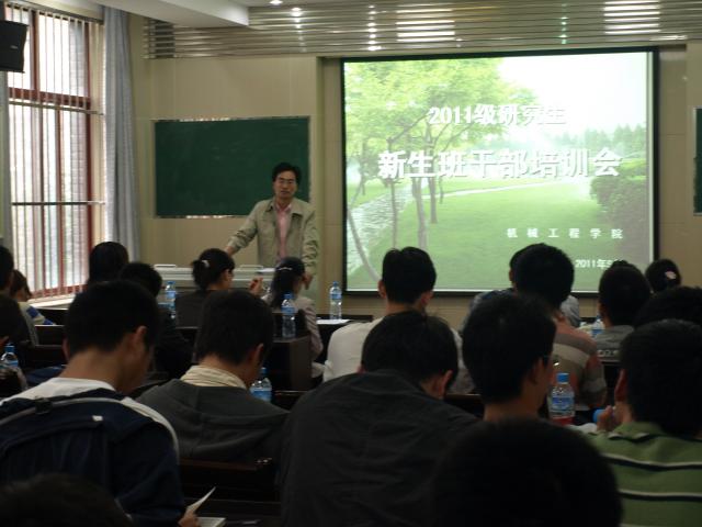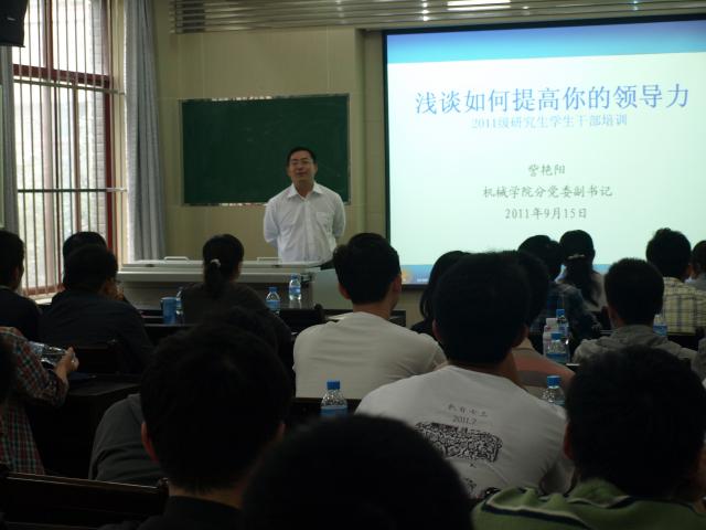 院党委副书记訾艳阳教授高屋建瓴为同学们做了题为“如何提高领导力”的报告,从对大学的理解与认识,机械学院的教育管理理念与措施,新一代研究生的特点与问题,对班干部的定位与理解以及什么是领导力等几个方面为新老干部做了精彩的报告,并对新当选的班长、支部书记提出了建议和要求,希望大家要多思考多实践,培养自己出色的组织领导能力。