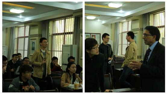 Asoke Kumar Nandi教授讲完报告之后与学生进行互动。Asoke Kumar Nandi教授就学生关心的问题:三篇文章信号处理中的压缩采样采用高斯随机矩阵;旋转机械FFT效果比WT好;如何让实验室环境逼近真实环境等做出回答。