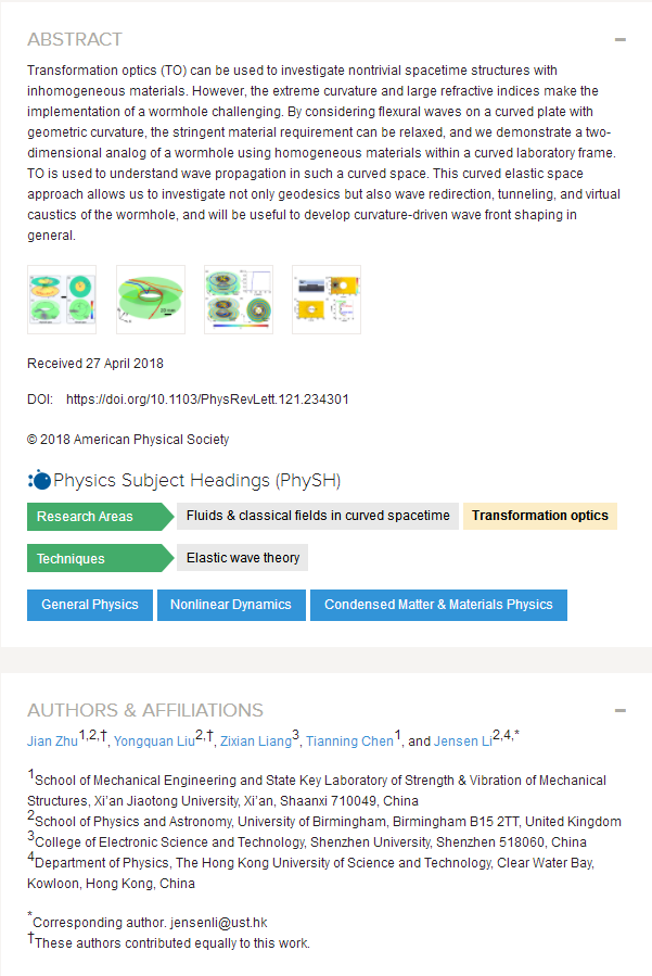 相关研究成果以“Elastic Waves in Curved Space: Mimicking a Wormhole”为题,近日在国际权威期刊Physical Review Letters上在线发表。西安交通大学koko体育·(中国)官网朱建为该论文的第一作者,西安交通大学koko体育·(中国)官网为该论文第一作者和第一单位。